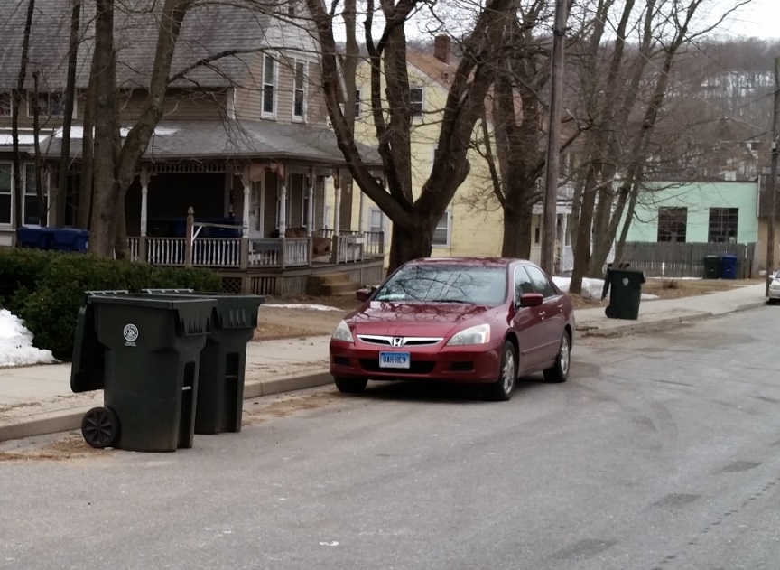 Customers without driveways and with on-street parking will place their carts to be picked up by the collection truck’s mechanical arm without having to reach over a parked car. This is typically done by putting the cart slightly into the street between parked cars.